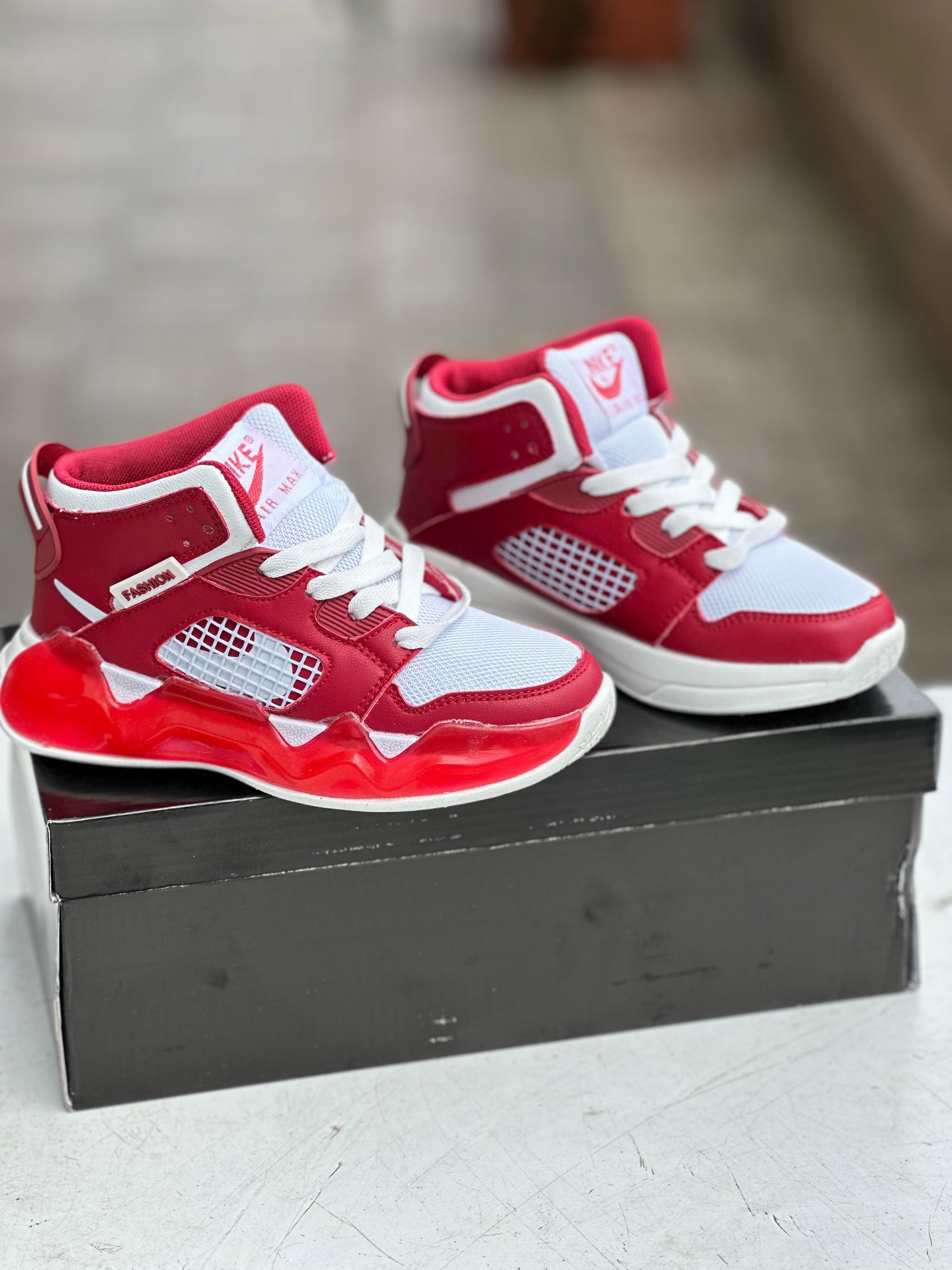 Brighten up your child's outfit with these bold red and white high-top sneakers. Featuring a breathable mesh upper, smooth synthetic overlays, and a chunky, cushioned sole, these kicks provide the perfect combo of comfort and style. The vibrant red design adds a sporty edge, making them a standout choice for both casual wear and active play.