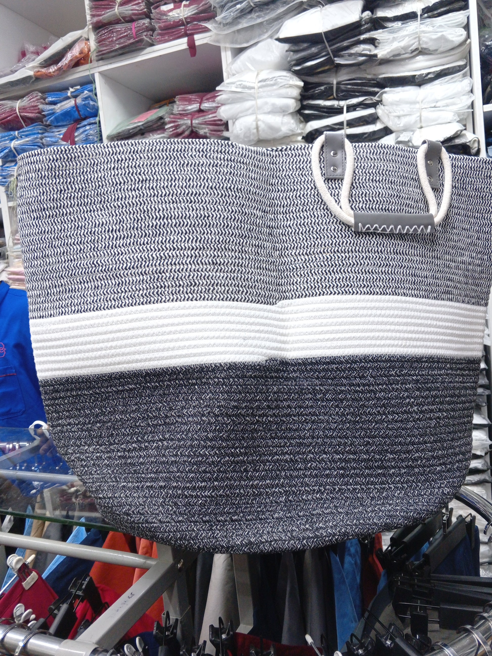 This is a handwoven storage basket featuring a two-tone design with white and tan/brown horizontal stripes. The basket has a square or slightly rectangular shape with a flat bottom, allowing it to stand upright. It is equipped with two sturdy, rounded handles made from the same woven material, providing a comfortable grip for carrying. Two bright green pom-poms are attached to the upper corners, adding a playful decorative element. The overall construction suggests a durable and flexible material, suitable for storing various items in a home in Nairobi.